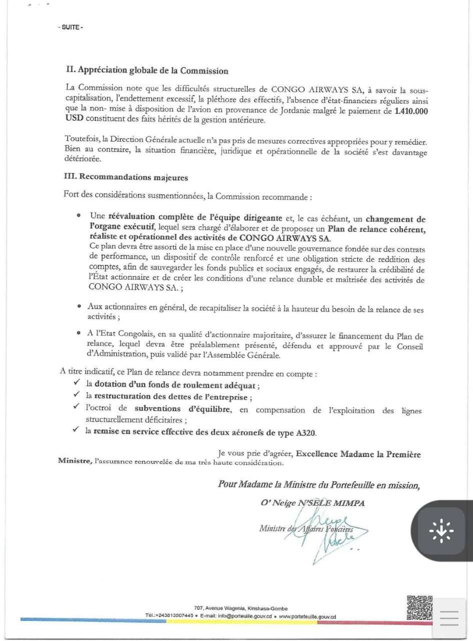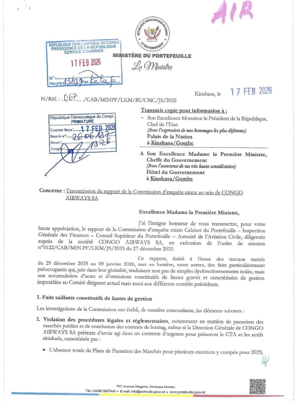 La mission, composée d'experts du Conseil Supérieur du Portefeuille, de l'Inspection Générale des Finances (IGF) et de l'Autorité de l'Aviation Civile (AAC), a passé au crible la gestion de Congo Airways. Les conclusions, transmises à la Cheffe du Gouvernement Judith Suminwa, sont accablantes.